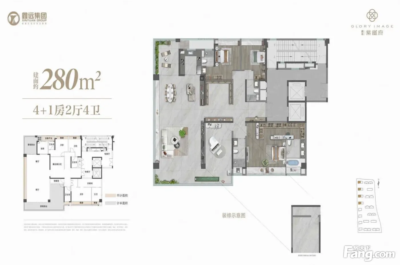 鑫远·紫樾府户型主要有280平-295平的全明格局,南北通透,户型方正,双卧朝南,三开间朝南,观景落地窗的五居 、180平-225平的南北通透,双卧朝南,观景飘窗的四居 。