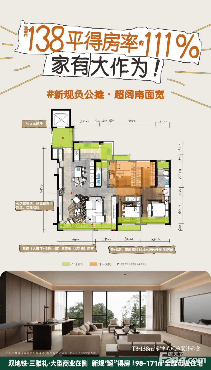 138平米得房率111%,独立电梯 ,小高层,南北通透,
