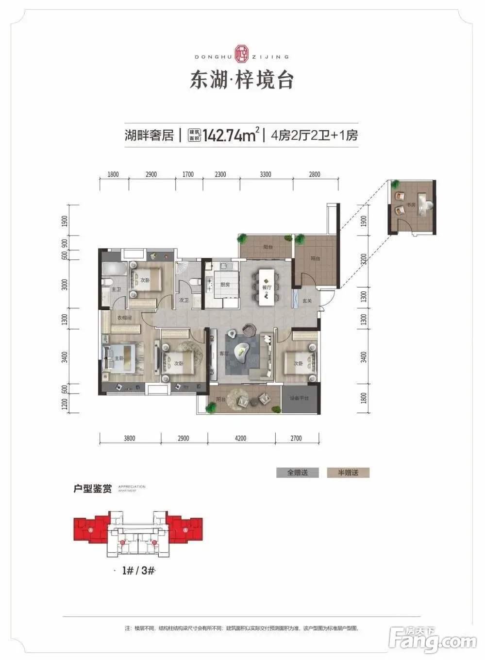 东湖·梓境台户型主要有142平-186平的三开间朝南,双阳台的四居 、127平-127平的主卧带卫,双卧朝南的三居 。