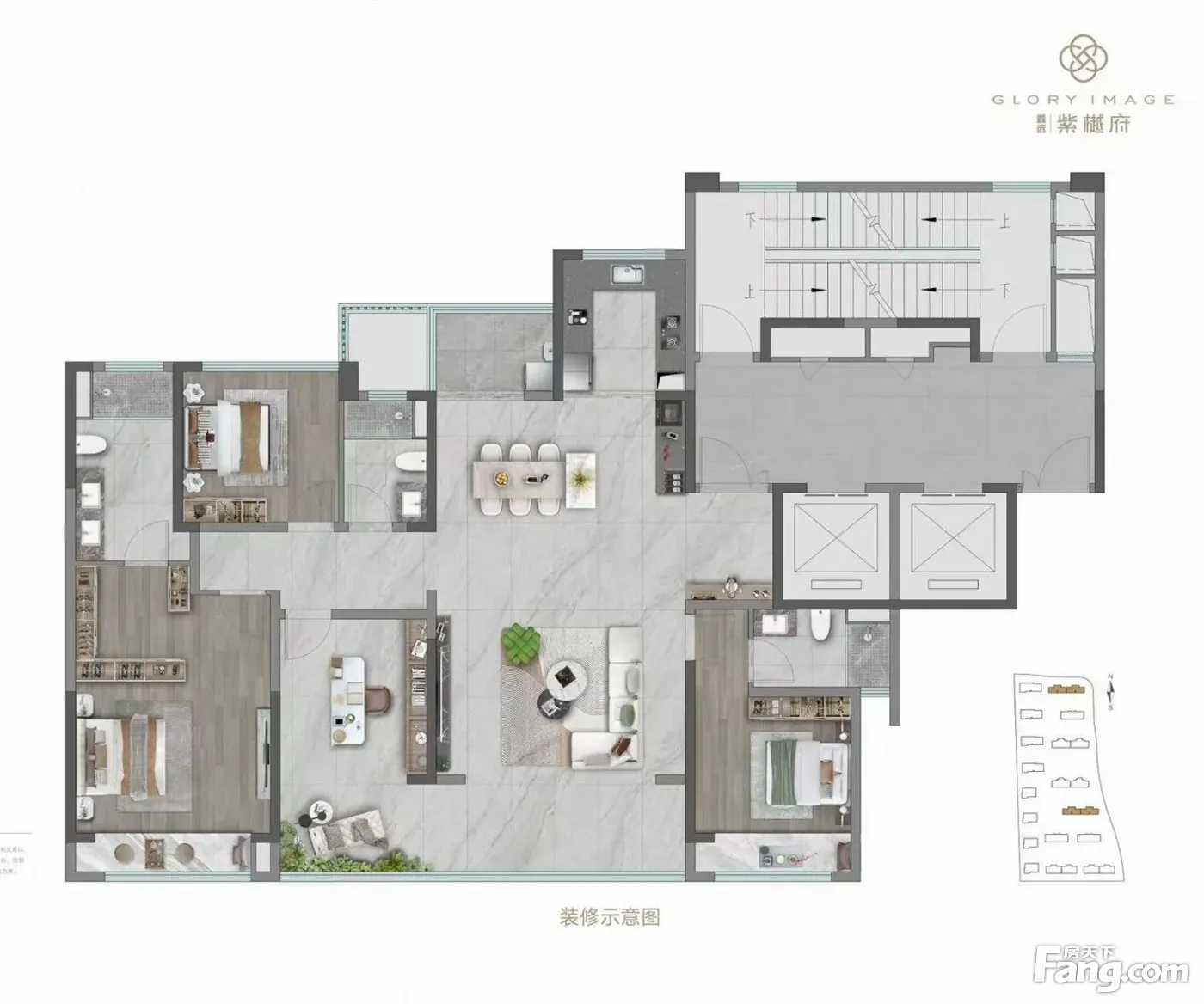鑫远·紫樾府户型主要有280平-295平的全明格局,南北通透,户型方正,双卧朝南,三开间朝南,观景落地窗的五居 、180平-225平的南北通透,双卧朝南,观景飘窗的四居 。