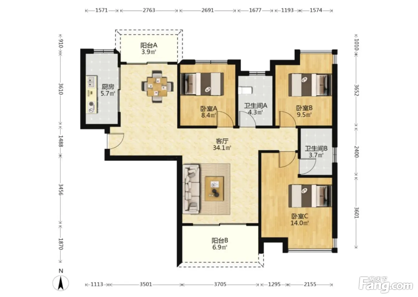 户型齐全,主打全明格局,户型方正,观景飘窗,L型厨房,双阳台三居
