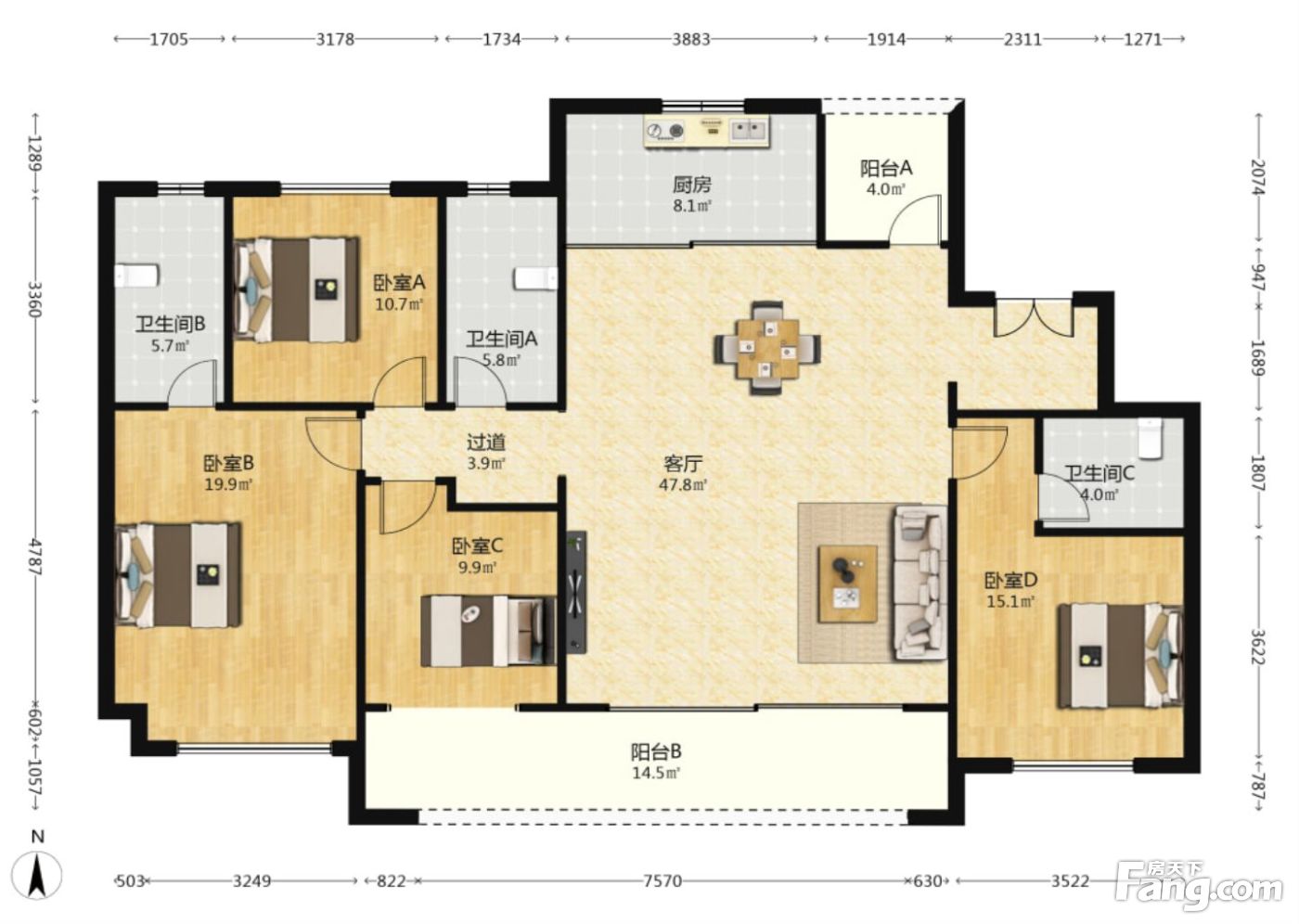 户型齐全,主打客厅朝南,卧室朝南,卧室带阳台,双阳台四居