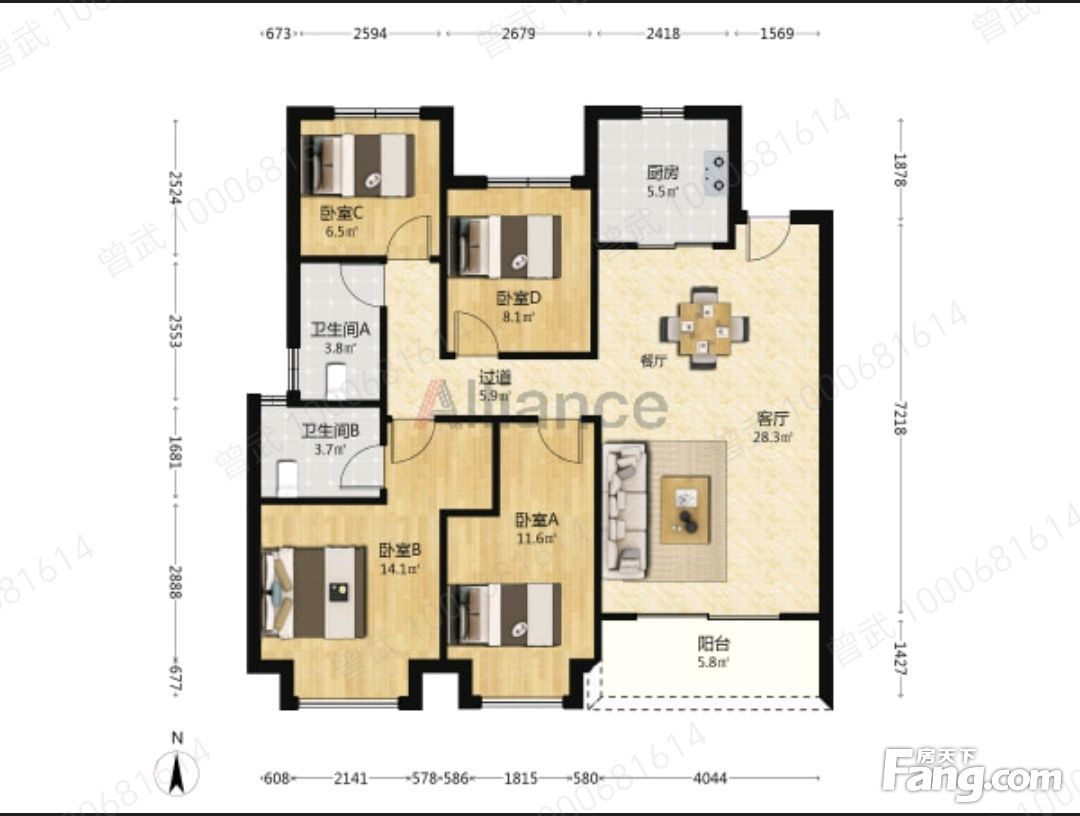 户型齐全,主打卧室带阳台,大面宽阳台四居