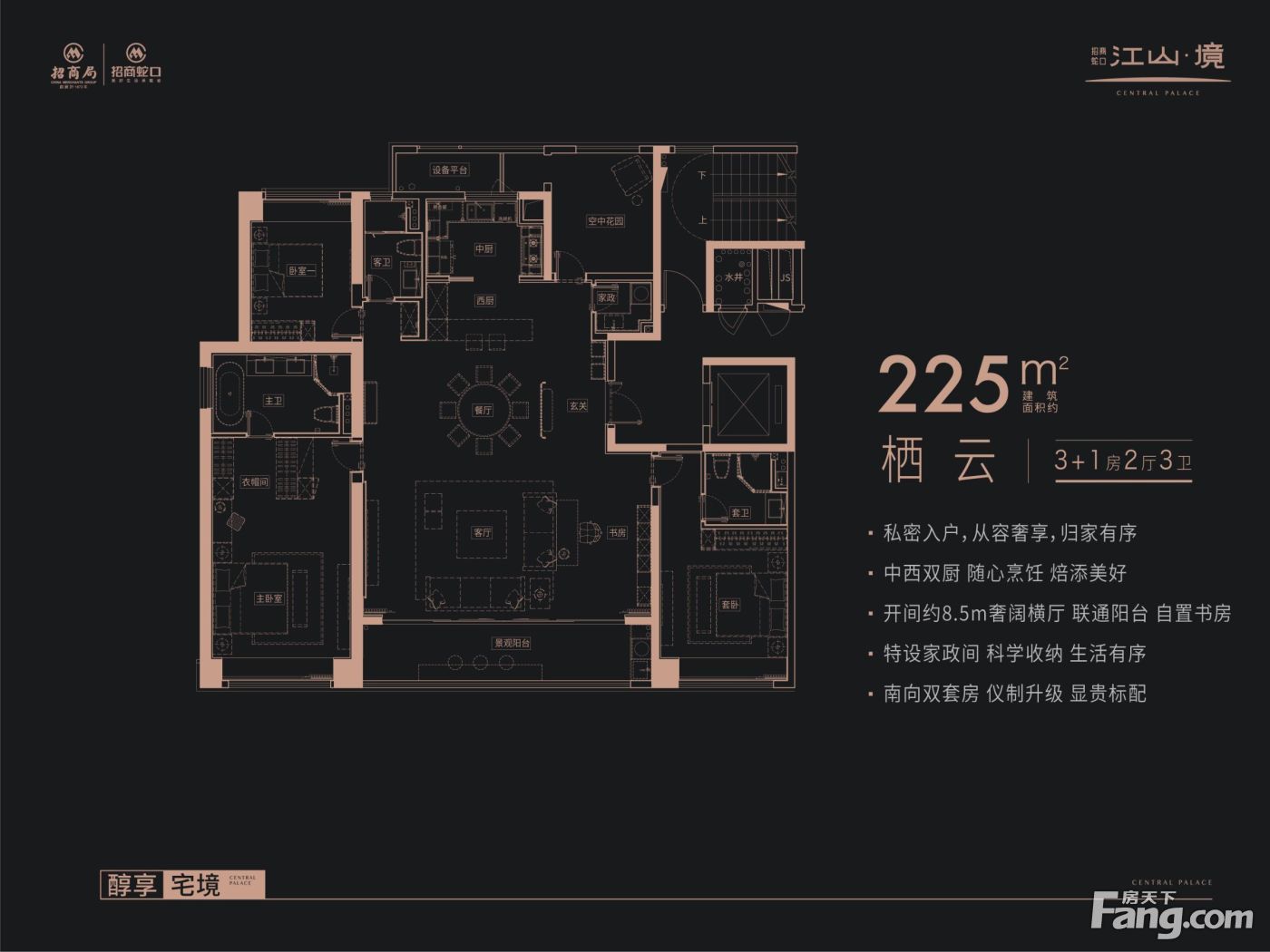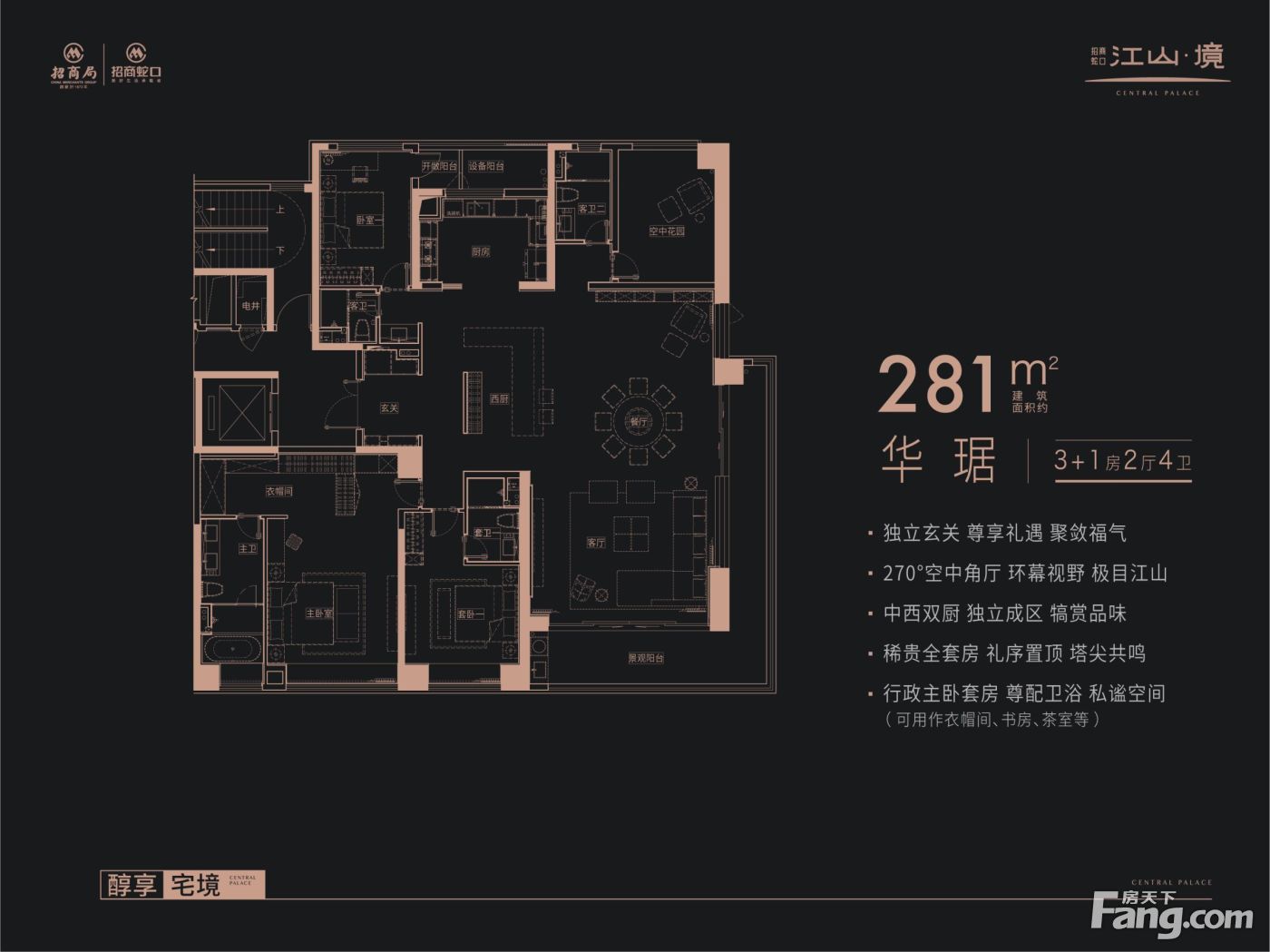 招商蛇口·江山境户型主要有190平-281平的户型方正,客厅朝南的四居 、278平-278平的户型方正,客厅朝南的五居 。