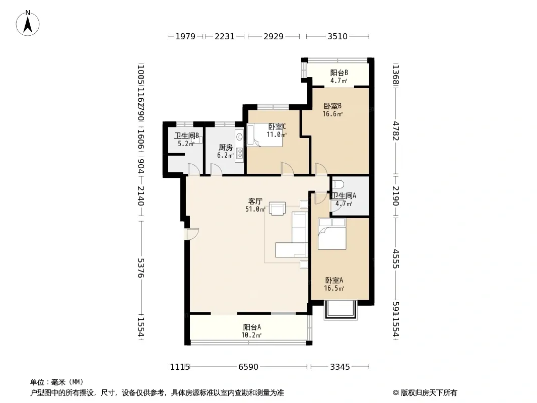 户型齐全,主打客厅朝南,双阳台三居
