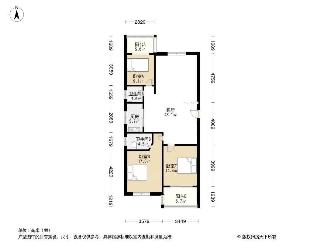 四季美景水木轩 3室1厅 南