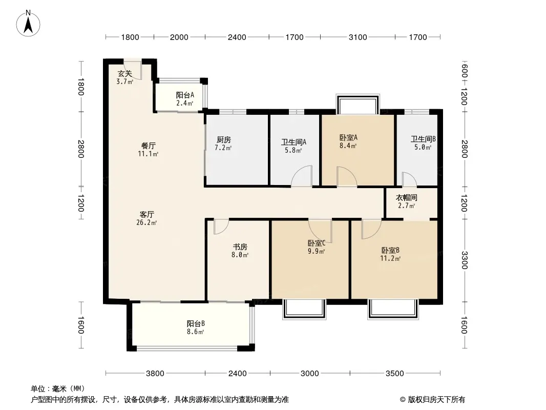 户型齐全,主打主卧朝南,主卧带卫,带衣帽间四居