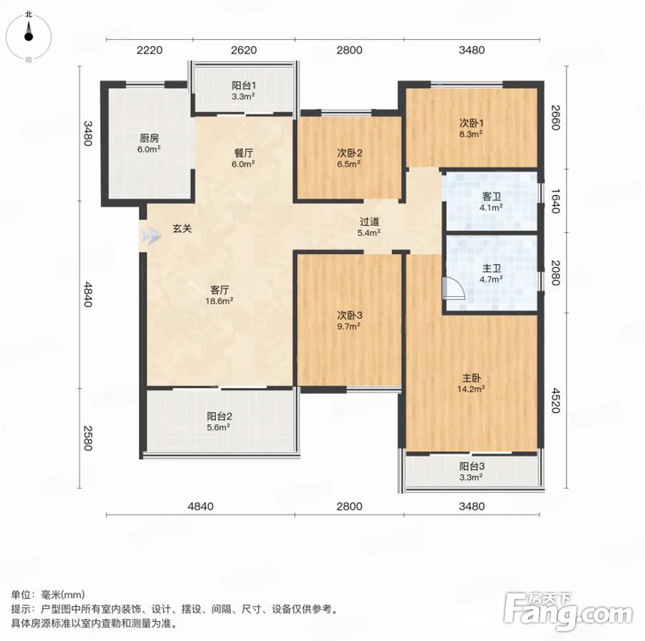 户型齐全,主打主卧朝南,主卧带卫,卧室带阳台三居