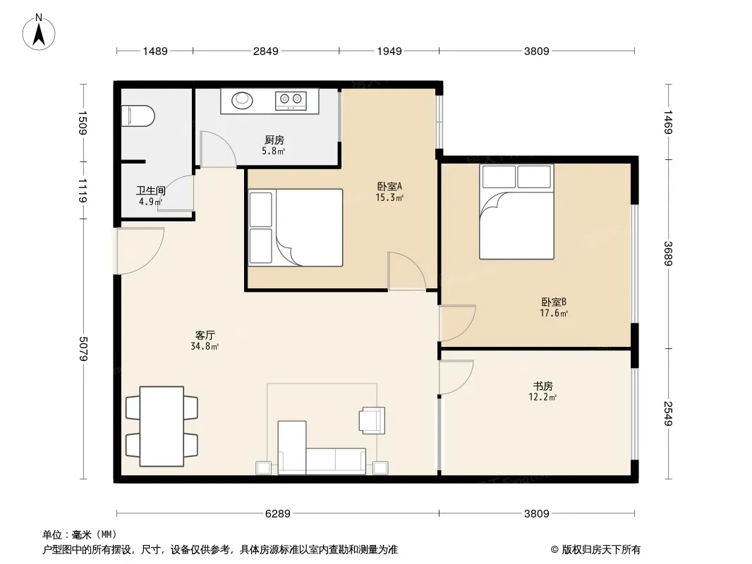 户型齐全,主打户型方正,明卫,明厨,客厅朝南,主卧朝南三居