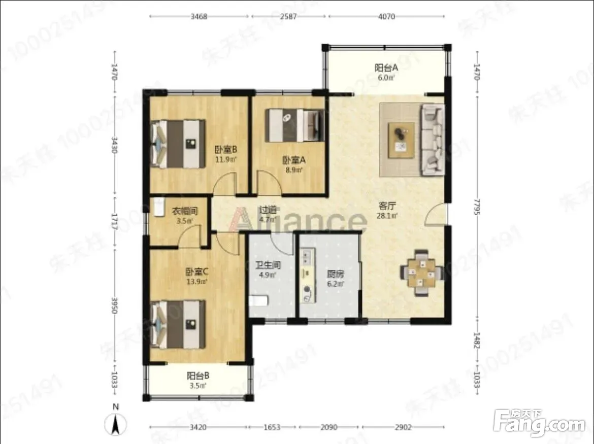 户型齐全,主打明卫,明厨,客厅朝南,双卧朝南三居