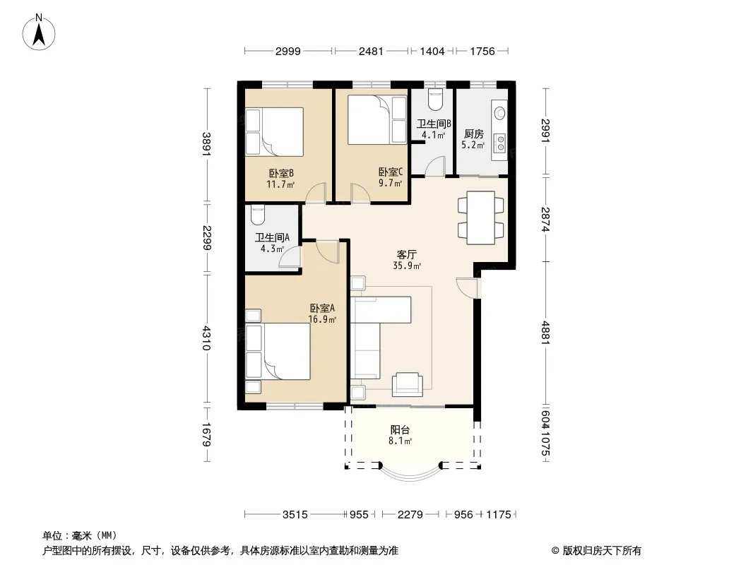 户型齐全,主打户型方正,明卫,明厨,主卧朝南三居