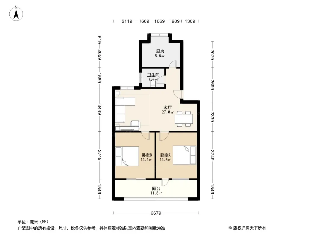 户型齐全,主打明厨,明卫,客厅朝南,全明格局,主卧朝南二居