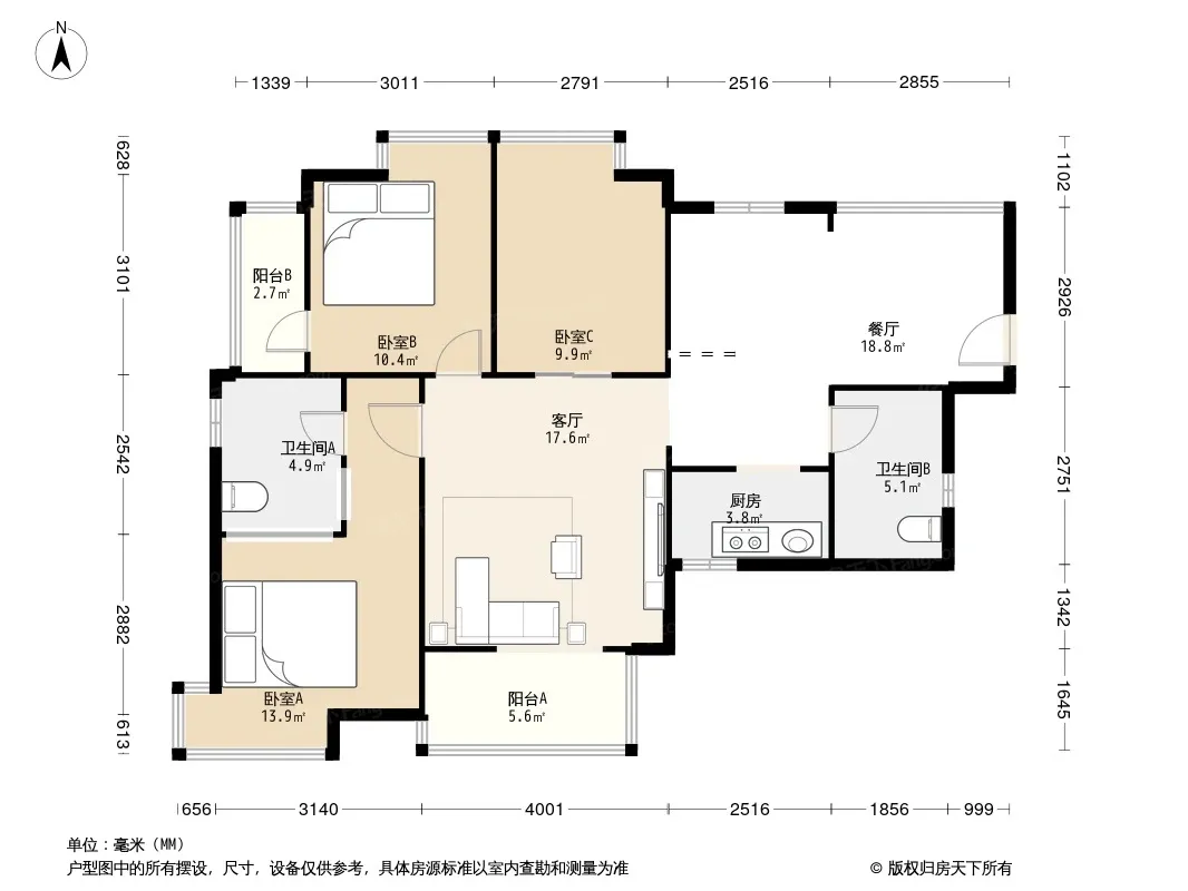 户型齐全,主打独立衣帽间,明卫,明厨,双阳台,主卧朝南三居