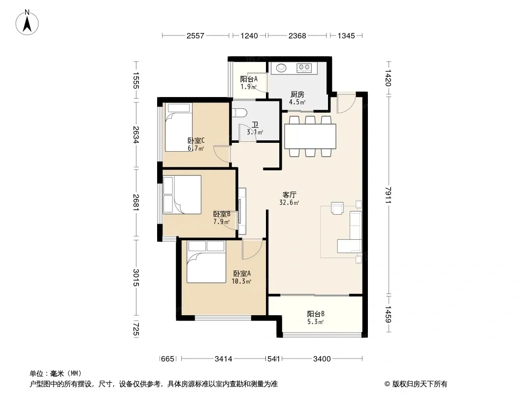 户型齐全,主打双阳台,双卧朝南,主卧朝南三居