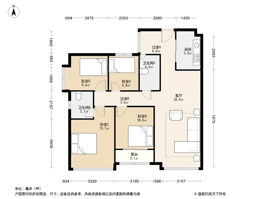 户型齐全,主打明卫,独立衣帽间,明厨,客厅朝南,全明格局三居