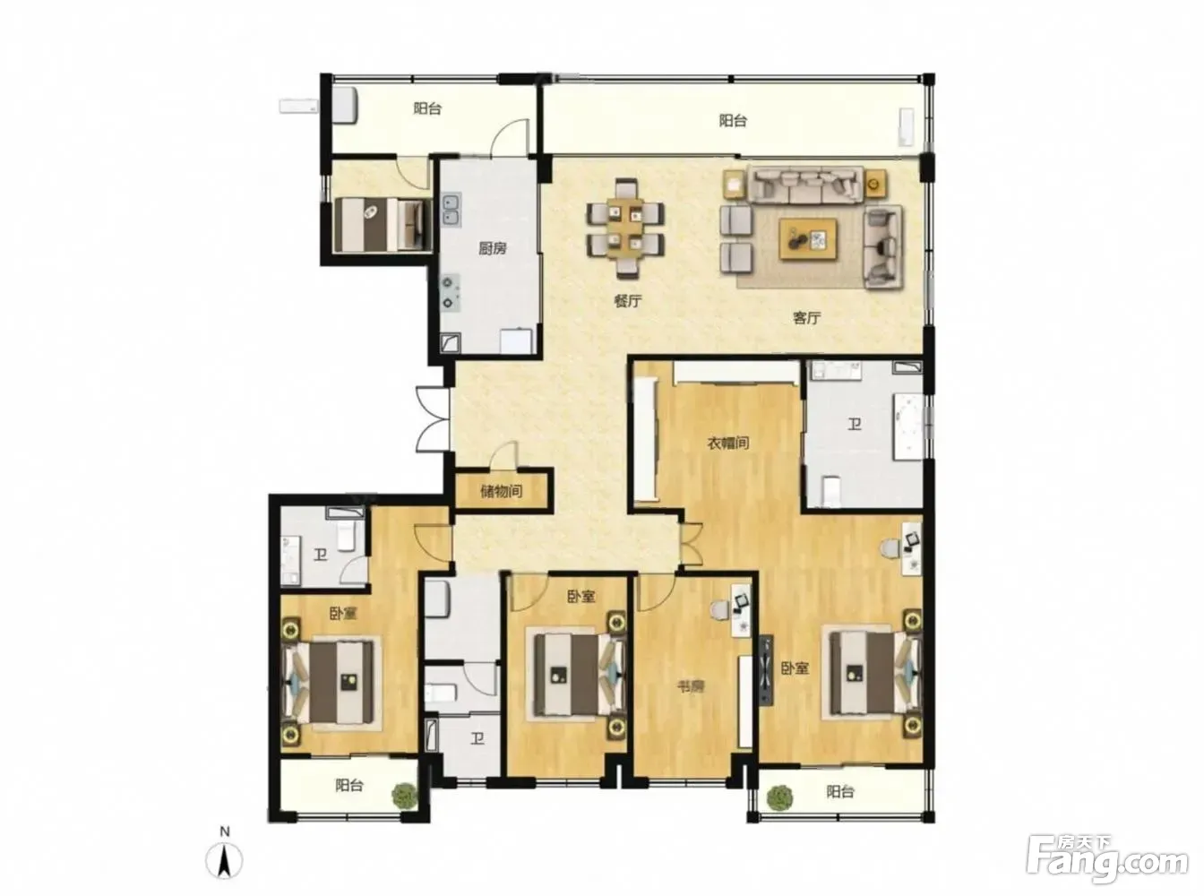 户型齐全,主打南北通透,全明格局,户型方正,客厅朝南,独立玄关,带衣帽间,开放厨房,双阳台四居