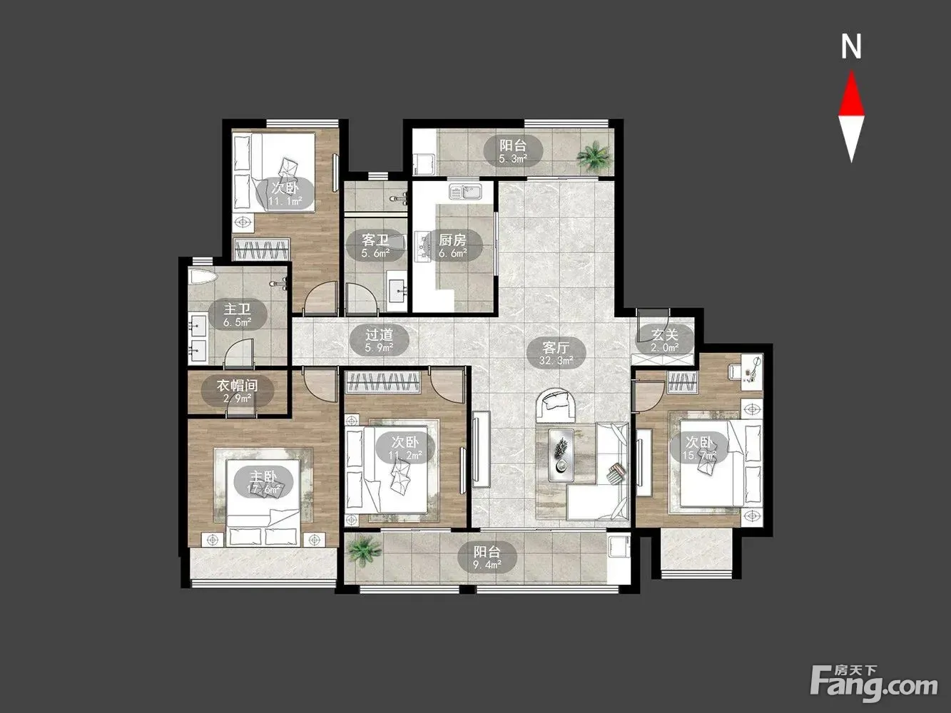 户型齐全,主打户型方正,卧室朝南四居