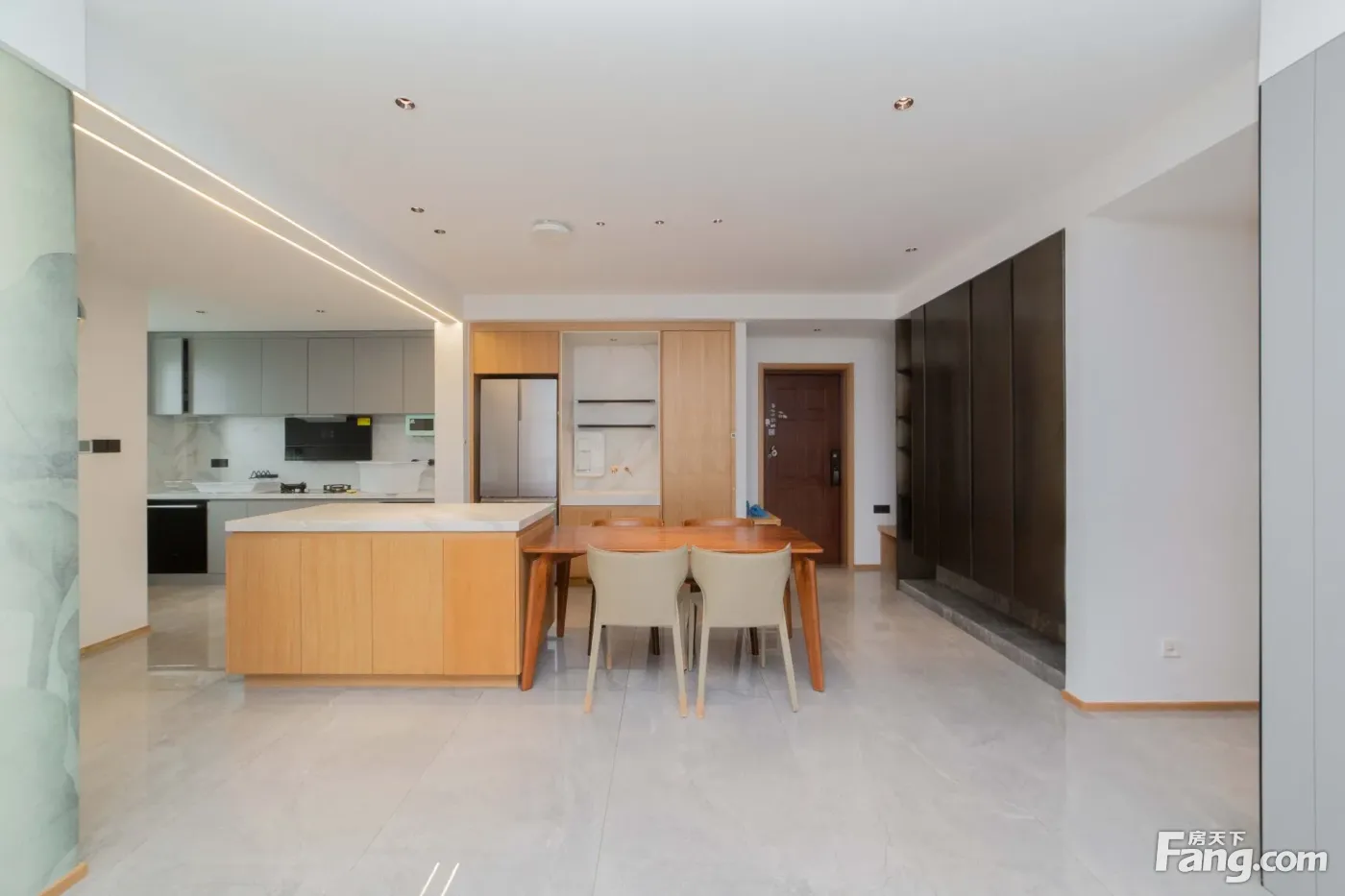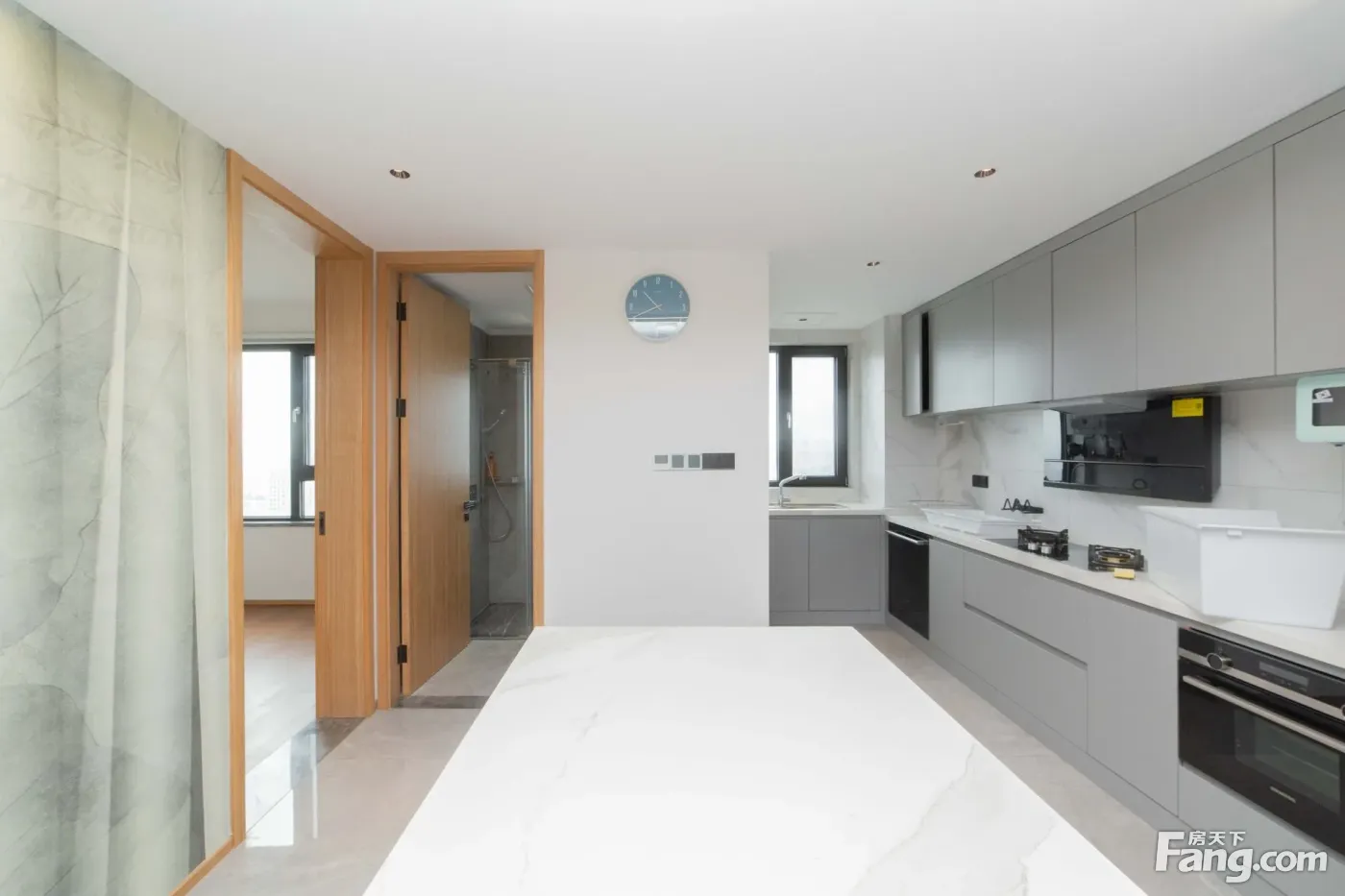 进门是一个玄关区域,沿墙布置一些储物柜,方便进出家门换鞋。 玄关另一侧就是厨房,买菜回家立刻就可以放进厨房,非常方便。U型厨房布置,更符台洗、切、煮的操作步骤,非常好 用。 厨房和餐厅中间通过玻璃隔断分隔,增加了通透感,隔绝了油烟。 阳台预留上下水,可以布置洗衣机、洗手盆,晾晒衣物,不会再洒得满屋水渍。 右边布置卧室区,动静分区明确,房间尺寸紧凑合理。 全飘窗赠送,增加了房间的空间延伸,更显得宽敞明亮。 主卧南北通长设计,打开南北窗户,自己就可以通风对流,舒适性增加很多。 北面的连廊遮挡了部分采光,这个是比较大的减分项。