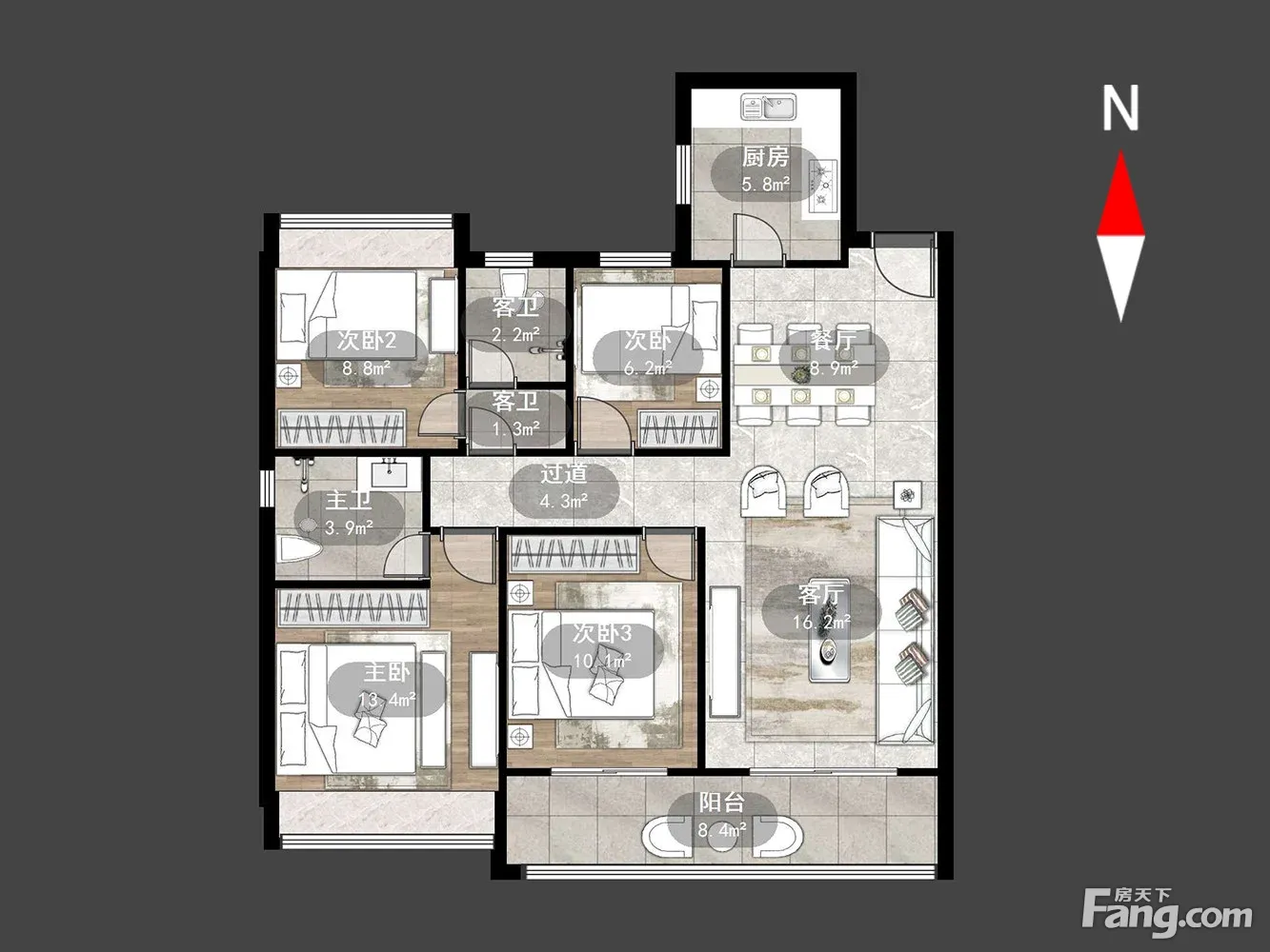户型齐全,主打南北通透,主卧带卫,双阳台四居