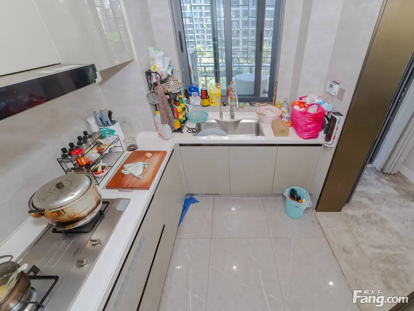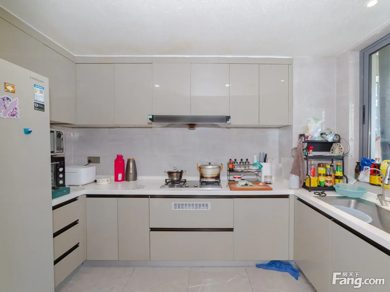 进门是一个玄关区域,沿墙布置一些储物柜,方便进出家门换鞋。 玄关另一侧就是厨房,买菜回家立刻就可以放进厨房,非常方便。U型厨房布置,更符台洗、切、煮的操作步骤,非常好 用。 厨房和餐厅中间通过玻璃隔断分隔,增加了通透感,隔绝了油烟。 阳台预留上下水,可以布置洗衣机、洗手盆,晾晒衣物,不会再洒得满屋水渍。 右边布置卧室区,动静分区明确,房间尺寸紧凑合理。 全飘窗赠送,增加了房间的空间延伸,更显得宽敞明亮。 主卧南北通长设计,打开南北窗户,自己就可以通风对流,舒适性增加很多。 北面的连廊遮挡了部分采光,这个是比较大的减分项。