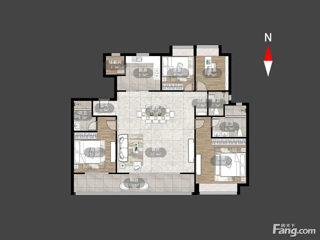 保利天珺户型主要有197平-342平的户型方正,主卧朝南的五居 、169平-169平的户型方正,卧室朝南的四居 。