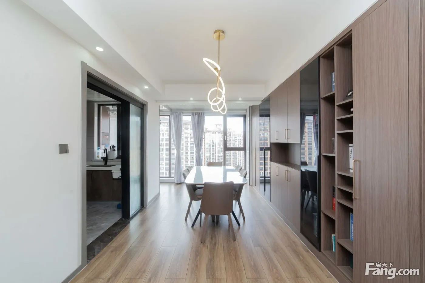 进门是一个玄关区域,沿墙布置一些储物柜,方便进出家门换鞋。 玄关另一侧就是厨房,买菜回家立刻就可以放进厨房,非常方便。U型厨房布置,更符台洗、切、煮的操作步骤,非常好 用。 厨房和餐厅中间通过玻璃隔断分隔,增加了通透感,隔绝了油烟。 阳台预留上下水,可以布置洗衣机、洗手盆,晾晒衣物,不会再洒得满屋水渍。 右边布置卧室区,动静分区明确,房间尺寸紧凑合理。 全飘窗赠送,增加了房间的空间延伸,更显得宽敞明亮。 主卧南北通长设计,打开南北窗户,自己就可以通风对流,舒适性增加很多。 北面的连廊遮挡了部分采光,这个是比较大的减分项。