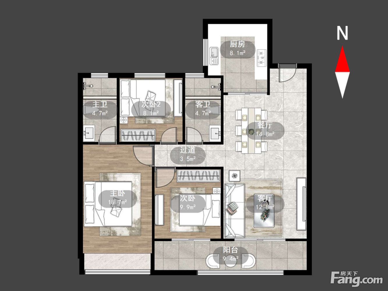 进门是一个玄关区域,沿墙布置一些储物柜,方便进出家门换鞋。 玄关另一侧就是厨房,买菜回家立刻就可以放进厨房,非常方便。U型厨房布置,更符台洗、切、煮的操作步骤,非常好 用。 厨房和餐厅中间通过玻璃隔断分隔,增加了通透感,隔绝了油烟。 阳台预留上下水,可以布置洗衣机、洗手盆,晾晒衣物,不会再洒得满屋水渍。 右边布置卧室区,动静分区明确,房间尺寸紧凑合理。 全飘窗赠送,增加了房间的空间延伸,更显得宽敞明亮。 主卧南北通长设计,打开南北窗户,自己就可以通风对流,舒适性增加很多。 北面的连廊遮挡了部分采光,这个是比较大的减分项。