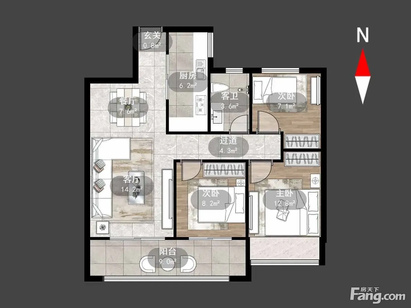 户型齐全,主打户型方正,卧室朝南,双阳台三居