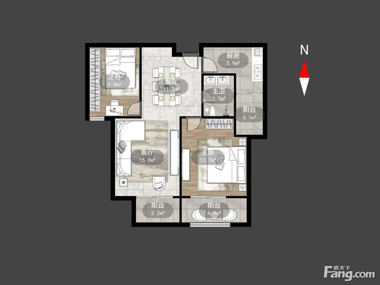 户型齐全,主打户型方正,明厨,明卫,独立衣帽间,双卧朝南三居