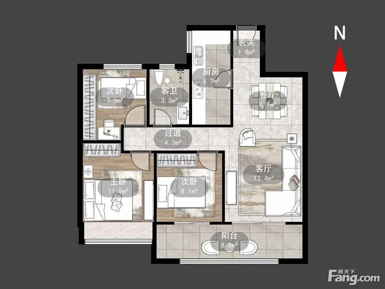 户型齐全,主打户型方正,卧室朝南,双阳台三居