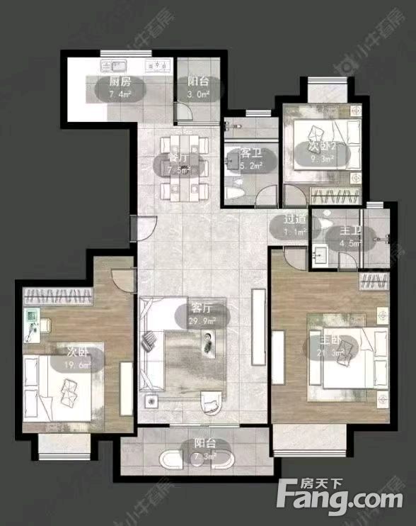 户型齐全,主打户型方正,明卫,明厨,独立衣帽间,客厅朝南,双卧朝南,主卧朝南四居