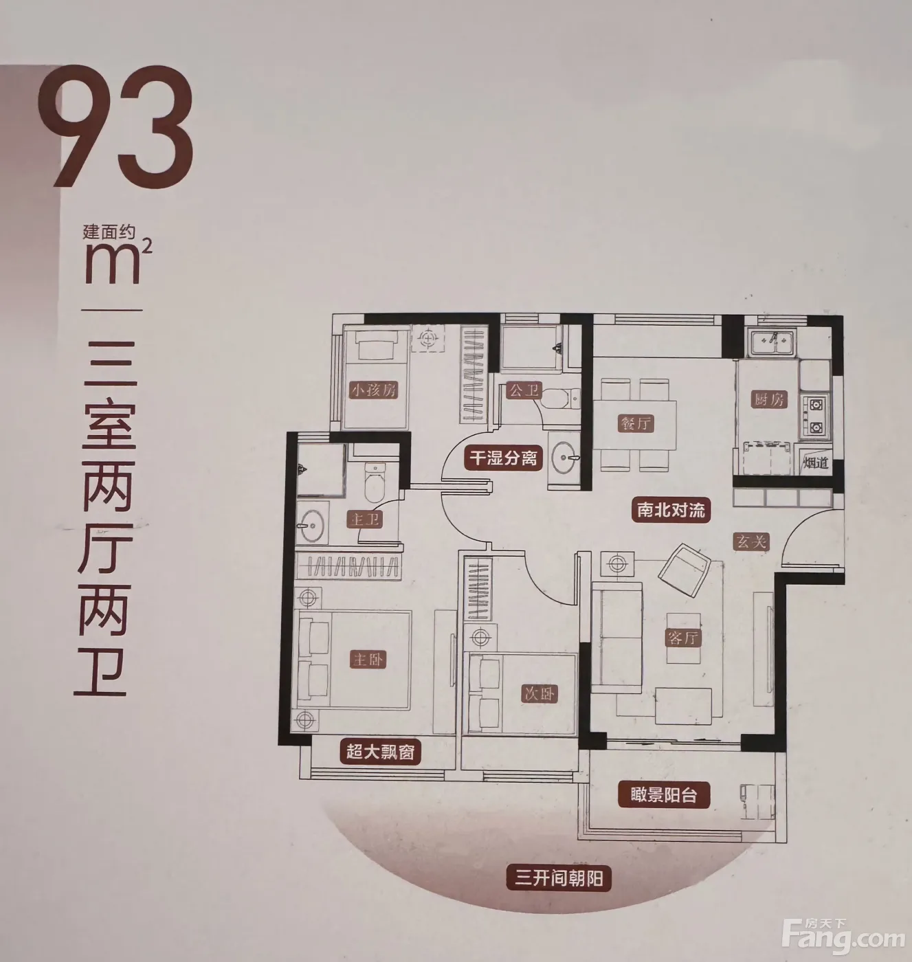 户型齐全,主打南北通透,动静分离,三开间朝南,主卧带卫,观景飘窗,U型厨房,大面宽阳台三居