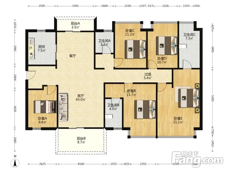 万象府 中高层毛坯五房双套间 南北对流户型
