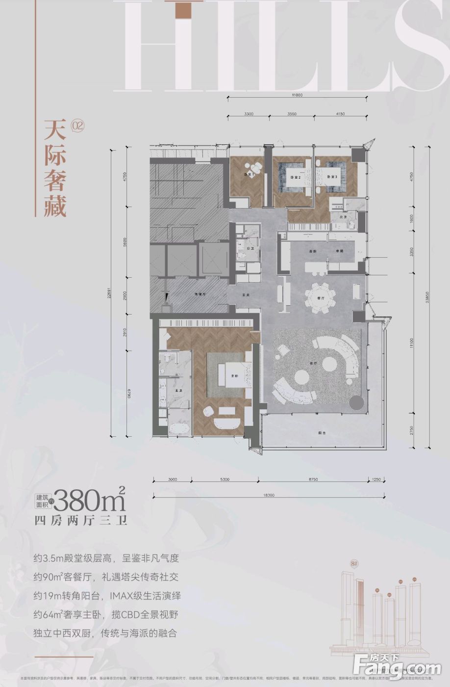 华润置地中心·悦府户型主要有308平-380平的中西双厨,户型方正,全明格局,动静分离,采光充足,独立玄关,大面宽阳台的四居 。