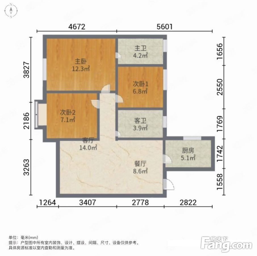 户型齐全,主打户型方正,明厨,明卫,客厅朝南三居