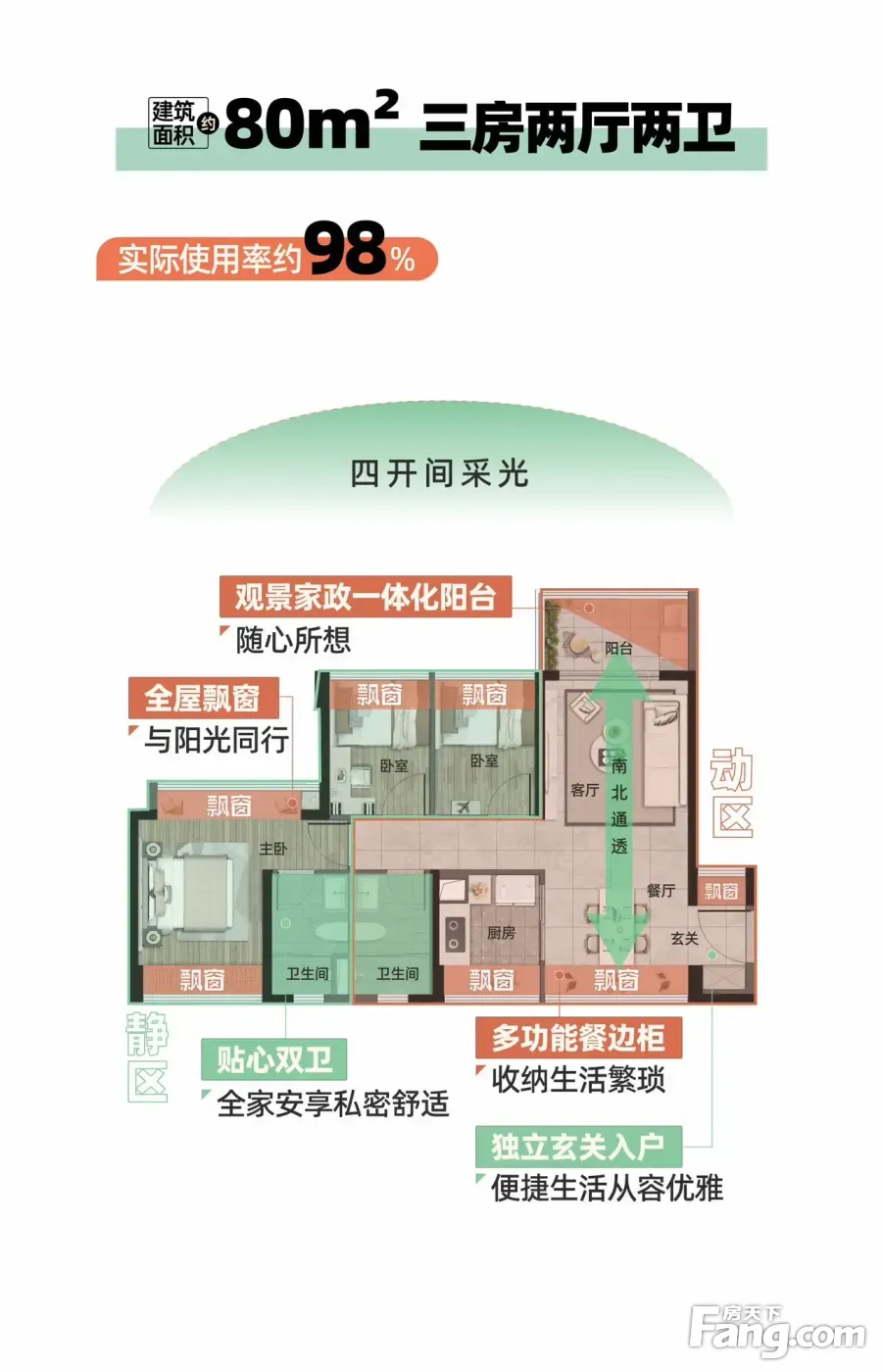 户型齐全,主打全明格局,户型方正,采光充足,主卧带卫,观景飘窗,U型厨房,明厨明卫三居
