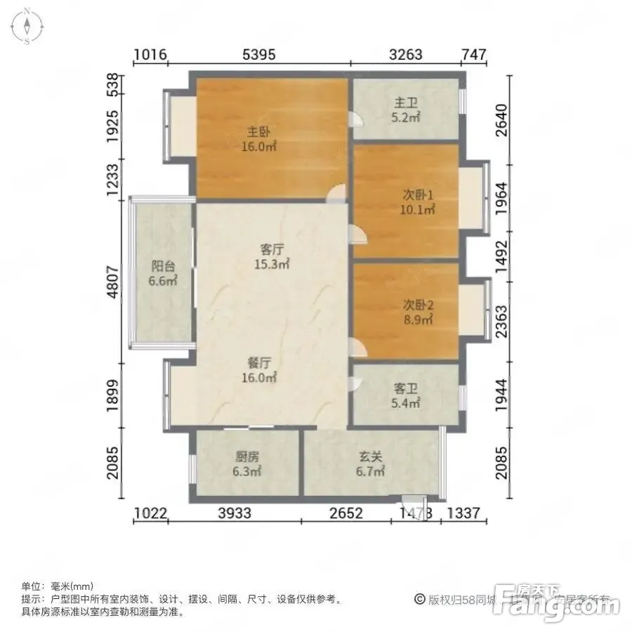 户型齐全,主打采光充足,客厅朝南,主卧朝南,主卧带卫三居