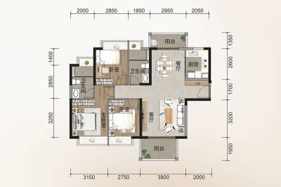 户型齐全,主打南北通透,动静分离,三开间朝南,主卧带卫,观景飘窗,干湿分离,双阳台三居