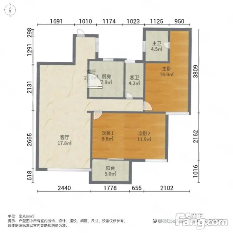 户型齐全,主打明卫,客厅朝南,双卧朝南,主卧朝南三居
