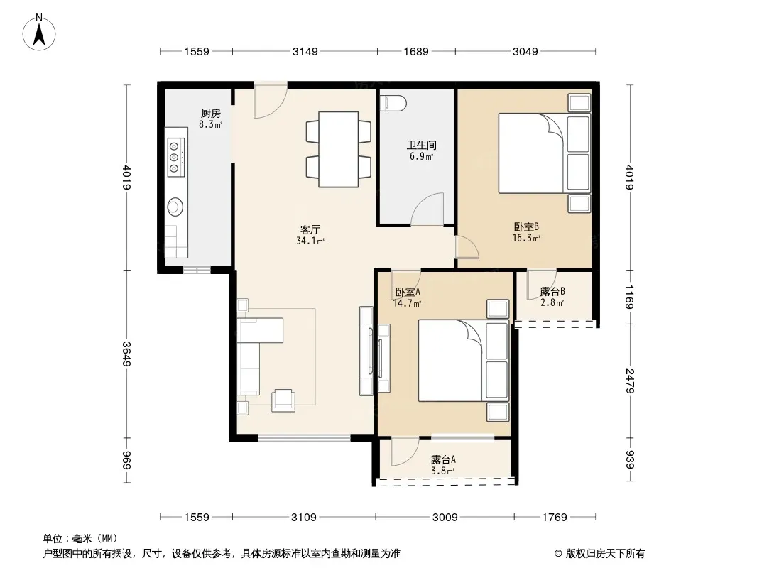 户型齐全,主打户型方正,明厨,主卧朝南二居