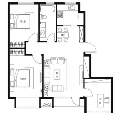 户型齐全,主打户型方正,明厨,主卧朝南二居