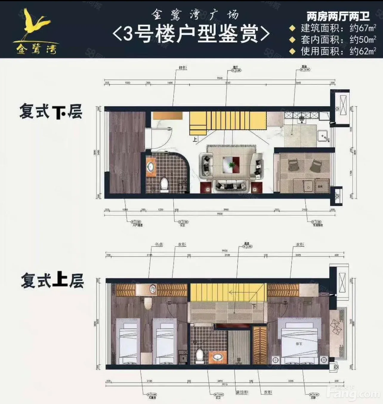金鹭湾广场复式2层电梯房 2室2卫 可改小3房 房东直卖