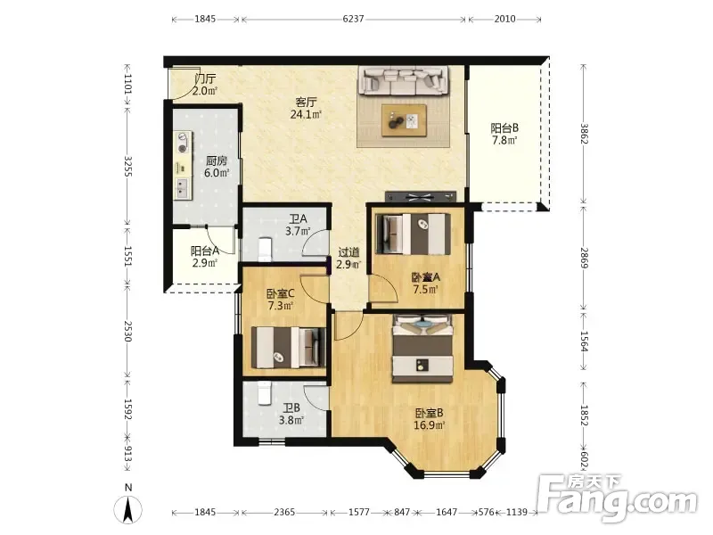 户型齐全,主打户型方正,明卫,客厅朝南,双阳台三居