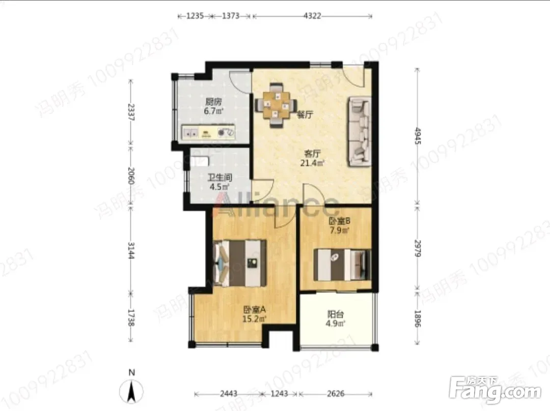 户型齐全,主打明卫,明厨,客厅朝南,双阳台四居