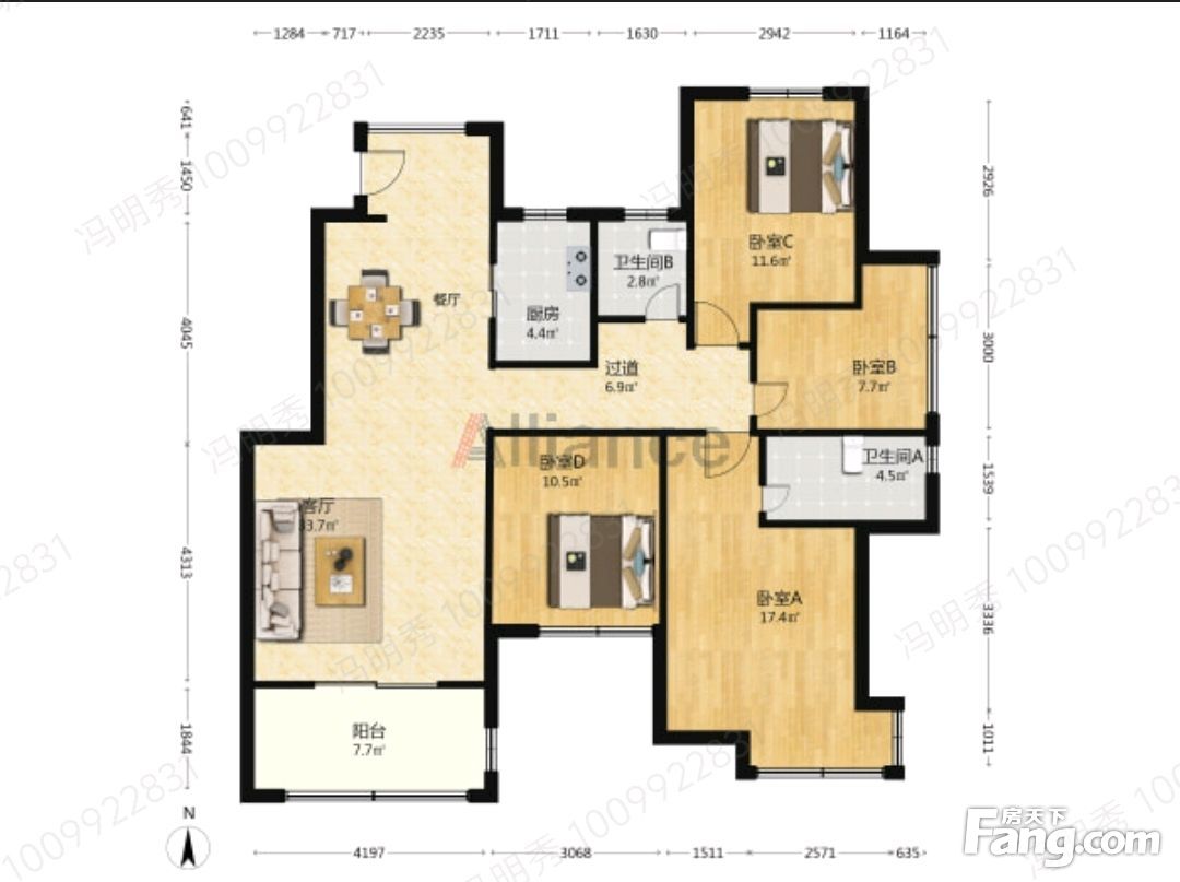 户型齐全,主打明厨,明卫,客厅朝南,全明格局,双卧朝南四居
