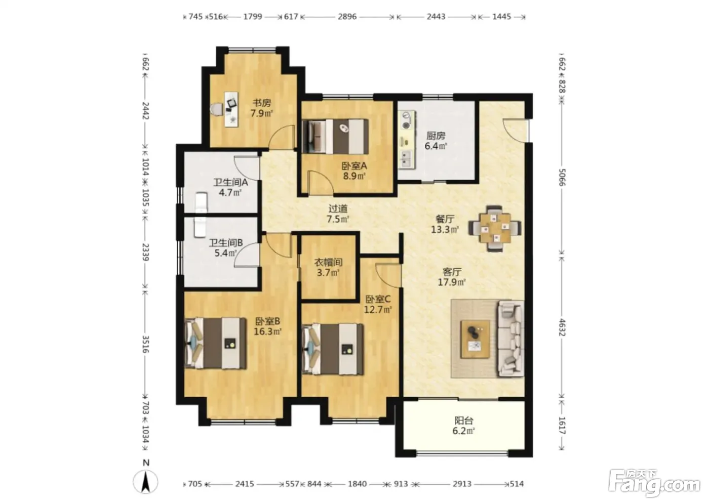 户型齐全,主打明卫,客厅朝南,双阳台三居