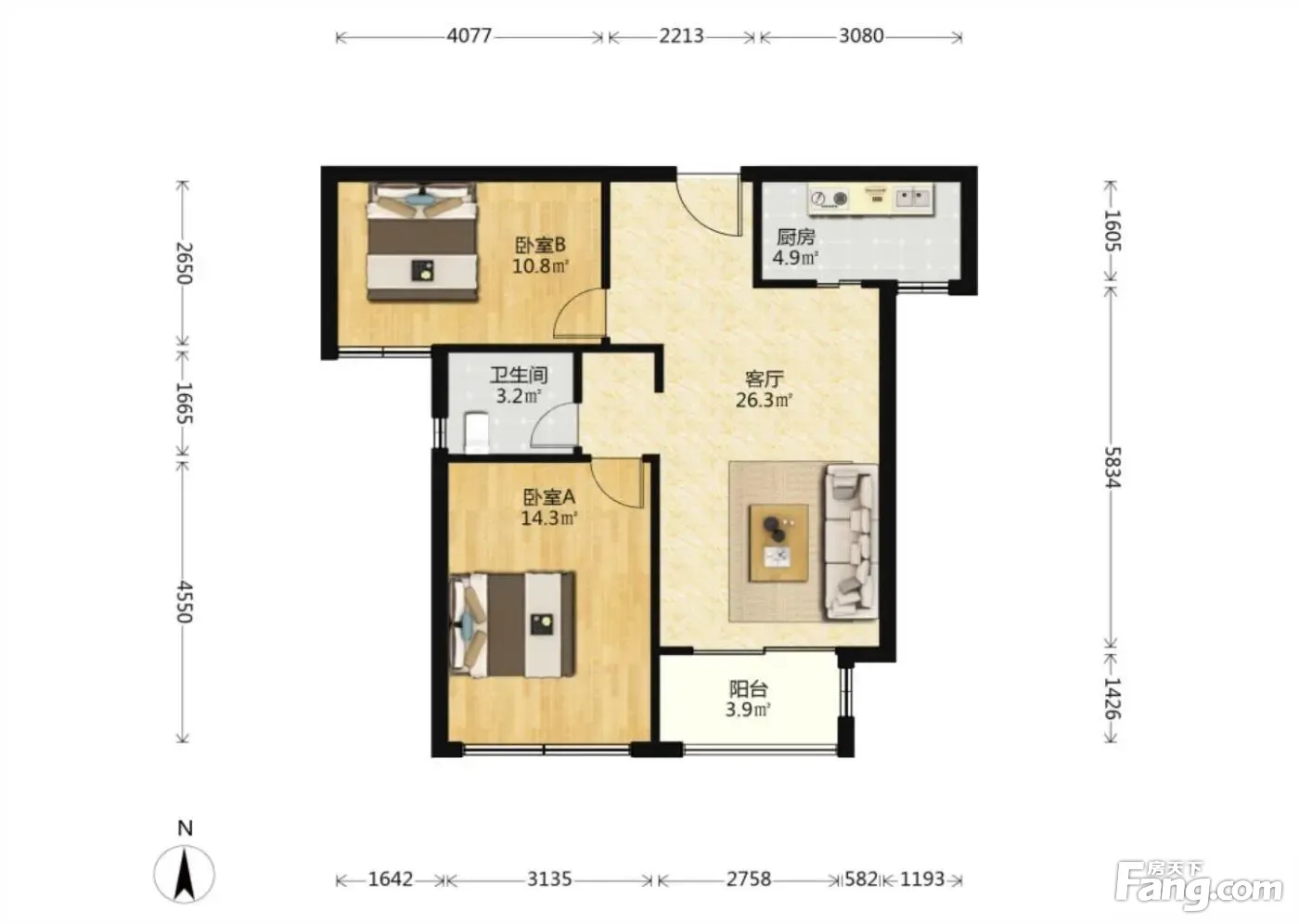 户型齐全,主打户型方正,明厨,明卫,客厅朝南二居