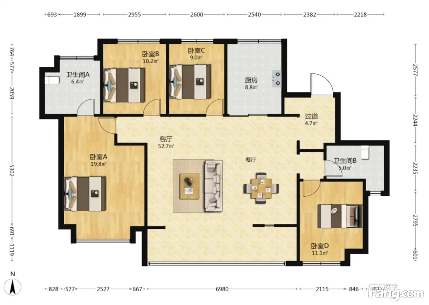户型齐全,主打南北通透,全明格局,采光充足,主卧套间,观景飘窗,卧室带阳台四居