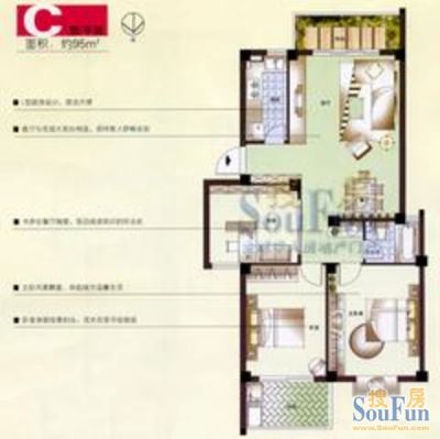 金色康城户型主要有95平-119平的户型方正,明卫,明厨,双阳台,双卧朝南,主卧朝南的三居 。