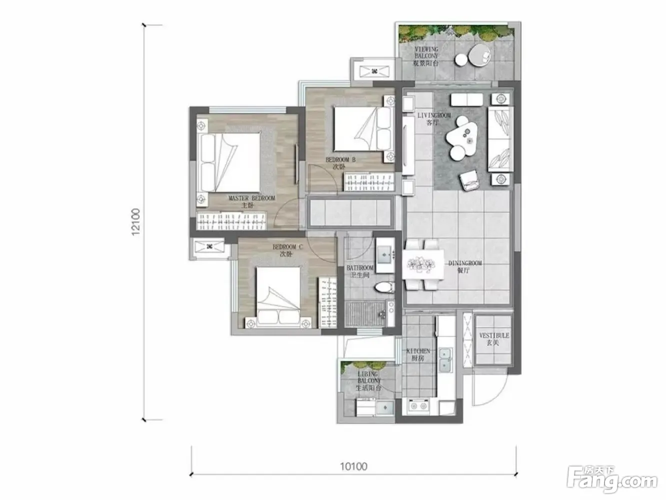 户型齐全,主打动静分离,L型厨房,双阳台三居
